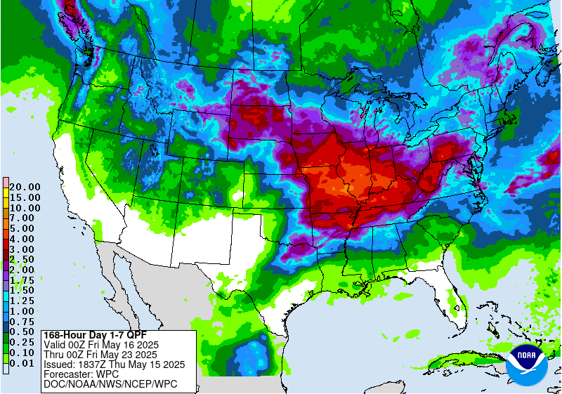 *The 168-hour QPF predicts heavy precipitation across a large portion of the central United States along the Mississippi and Ohio River Basins.
