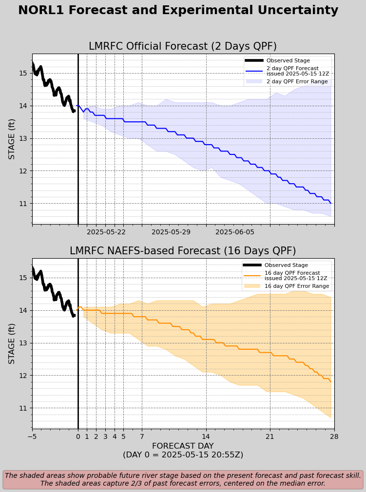 “The graph below is reproduced from NOAA’s National Weather Service website and represents an experimental product to account for the complexity of accurately predicting long-range precipitation.  These forecast projects stage levels based on expected precipitation for 2 days (top) and 16 days (bottom) and was developed within the North American Ensemble Forecast System (NAEFS) computer model and highlights Quantitative Precipitation Forecasts (QPF).  Along with the forecasts, a shaded area is also provided to indicate uncertainty for the forecast each day in the future. These plots are experimental and not an official forecast product.”