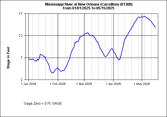 [Chart titled, Mississippi River at New Orleans (Carrollton) (01300) From 01/01/2025 To 05/15/2025]