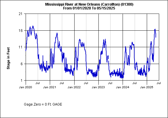 [Chart titled, Mississippi River at New Orleans (Carrollton) (01300) From 01/01/2020 To 05/15/2025]